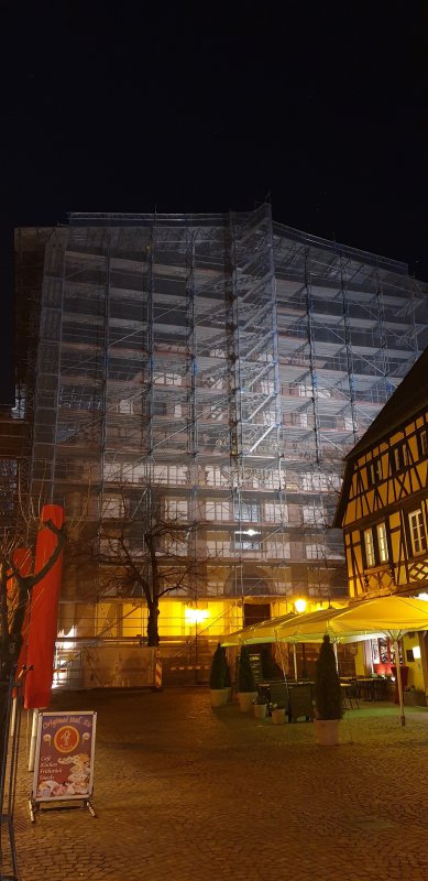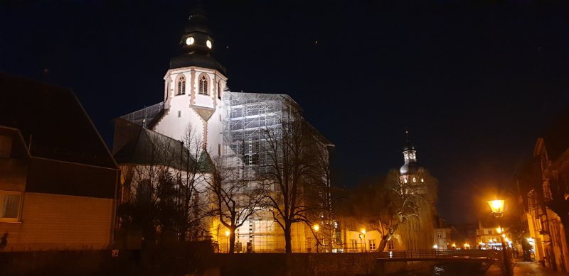 Die von den Stadtwerken Ettlingen und der Stadt Ettlingen betriebene Anstrahlung der Kirche in der Ettlinger Altstrahlt lässt das vernetzte Gerüst am Hauptschiff in einem besonderen Licht strahlen.