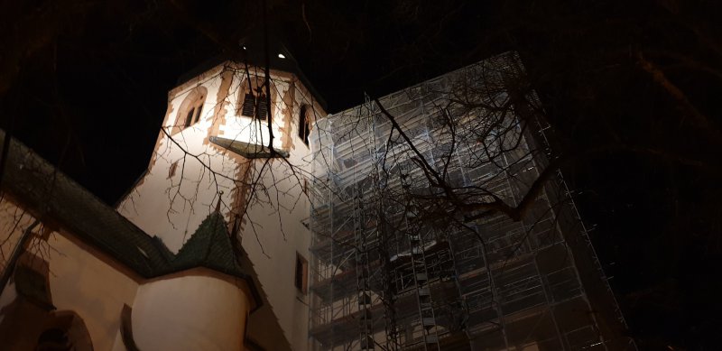 Abendaufnahmen des angestrahlten Gerüstes mit Wetterschutzdach an der Kirche St. Martin.