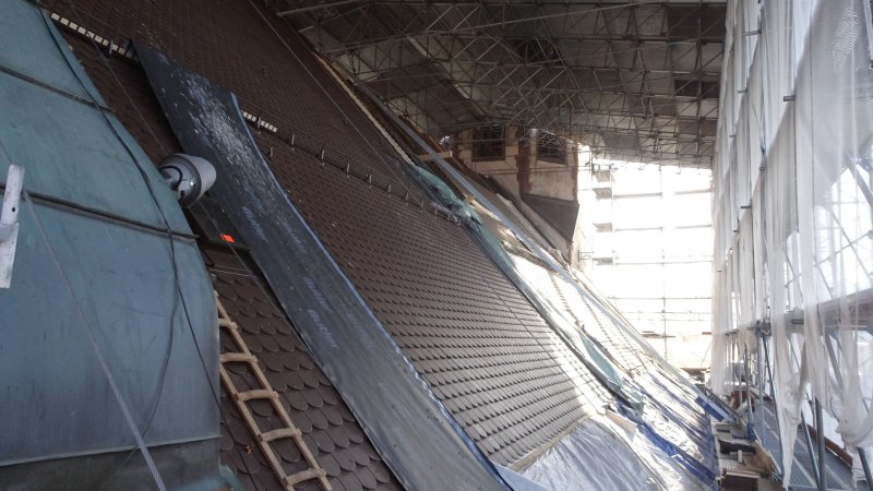 Auf den Fotos erkennt man nun auch die bereits wiedermontierten Strahler, welche später den Turm anstrahlen werden, sowie die neuen Schneefanggitter (im Farbton der Ziegel), Dachluken und Dachhaken.