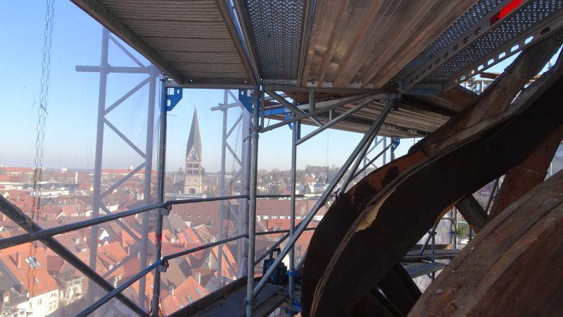 Demontage Holzkonstruktion Turm der Kirche St. Martin