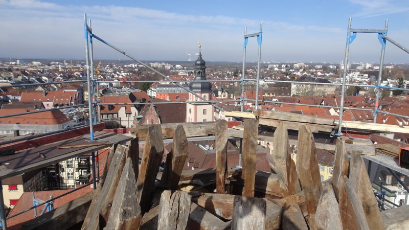 Bei derzeit sonnigem Wetter wird der Abbau der Holzkonstruktion am Turm der Kirche St. Martin in Ettlingen fortgerührt.
