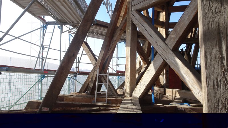 Die Schalung ist inzwischen komplett entfernt, sodass die Tragkonstruktion des Turmes sichtbar wird. Zu sehen sind die Bogenkonstruktion, welche dem Turm die zwiebelartige Form geben, die Haupttragkonstruktion und die unterste Balkenlage der Turmkonstruktion, welche auf dem gemauerten, achteckigen Turm aufliegt.