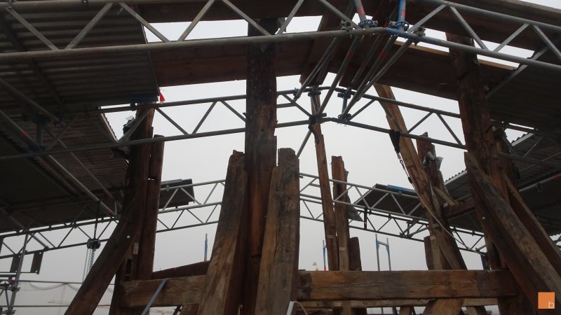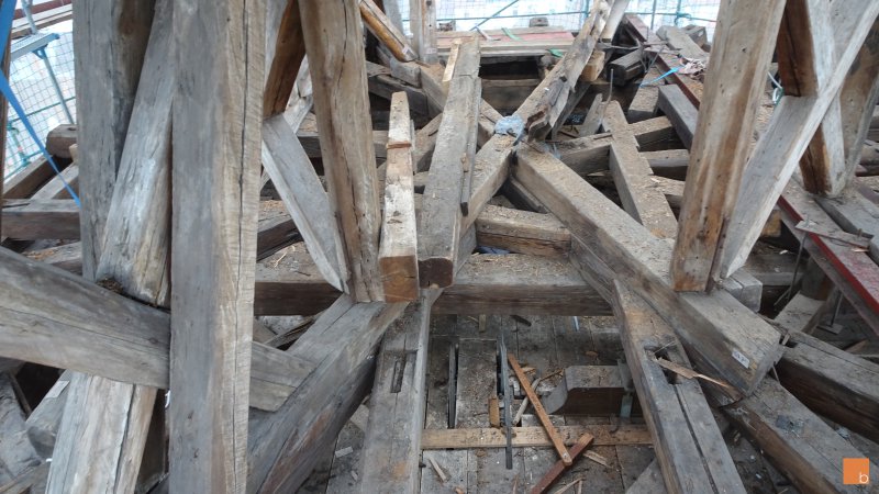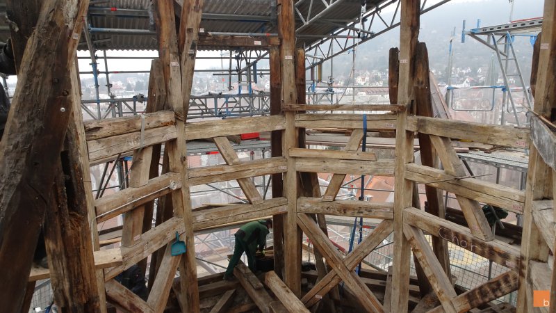 Aktuell wird die Haupttragkonstruktion nach und nach abgebaut, um die Balkenlage auf der Mauerwerkskrone des achteckigen Turmes sanieren zu können.