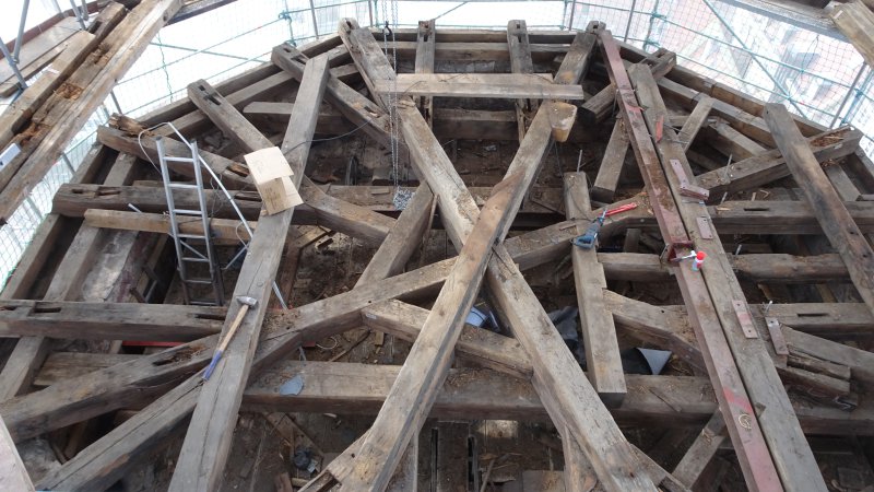In den kommenden Tagen wird die nun sichtbare Balkenlage auf der Mauerwerkskrone saniert und die Auflage der Hölzer überarbeitet.