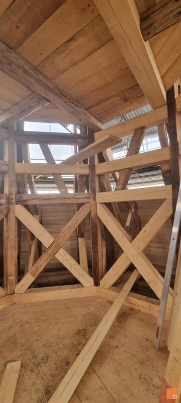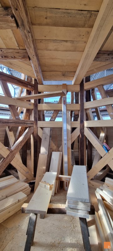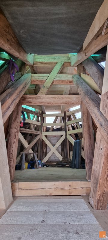 Steht man im Innern der Turmkonstruktion ist die neue Standfläche in Höhe der Mauerwerkskrone sichtbar. Diese wurde komplett neu eingebracht, sodass der Turmhelm (über der Glockenstube) sicher begangen werden kann.