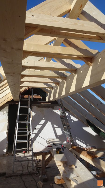 Neben dem Entfernen der Stützen der Firstpfetten, konnten durch neue Mittelpfetten auch die alten Pfetten (incl. deren Stützen) entfernt werden. Zusätzlich wurden die Sparrenhöhen vergrößert sowie erhaltene Sparren aufgedoppelt, um eine stärke Zwischensparrendämmung einbringen zu können.