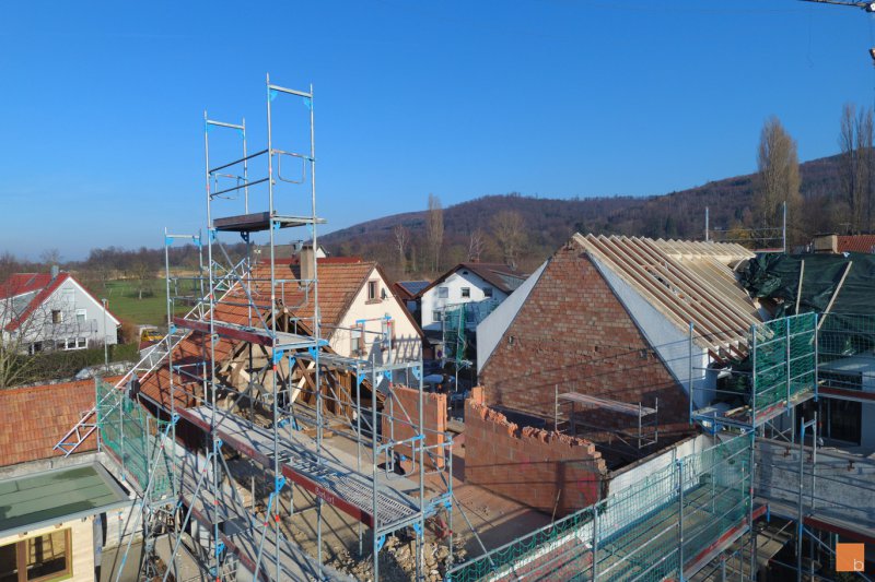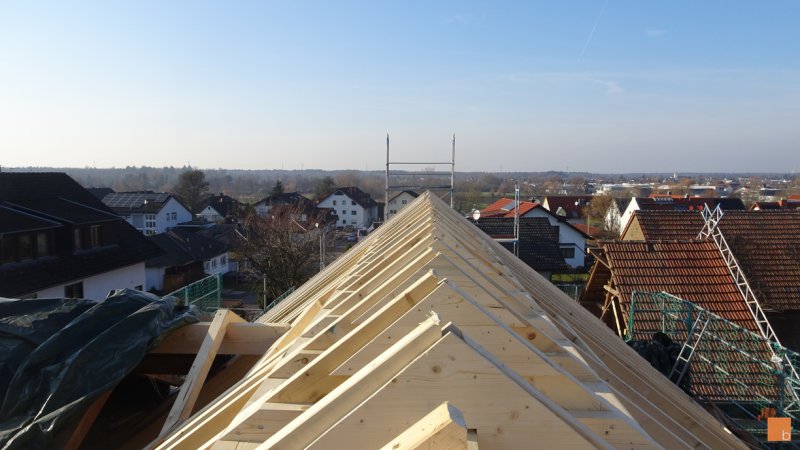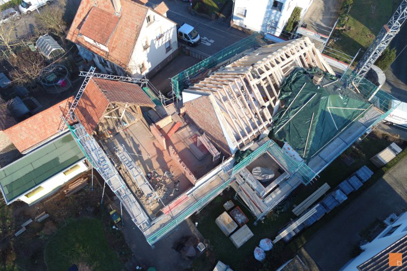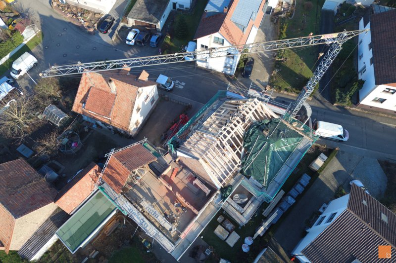 Während am rückwärtigen Gebäudeteil (ehemaliger Speicher) noch die finalen Abbrucharbeiten ausgeführt werden, sind die Zimmerarbeiten zum nun stützenfreien Dachstuhl am alten Bestand nahezu abgeschlossen.