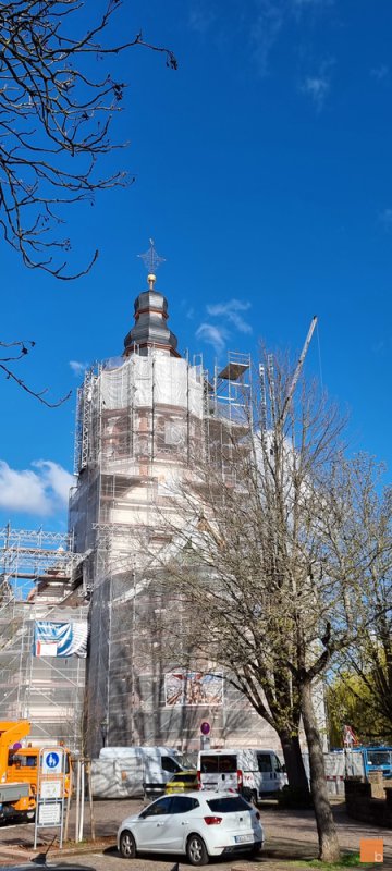 Auch die überarbeiteten Zifferblätter sind teilweise schon wieder erkennbar. in den kommenden Tagen wird die Uhrzeit ablesbar sein; sobald die nächtliche Anstrahlung der Gebäude in der Ettlinger Altstadt wieder eingeschaltet wird, wird die Uhr neu erleuchten.