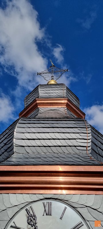 Der neu vergoldete Wetterhahn, das überarbeitet Kreuz und die neu vergoldete Kugel sind nun wieder weithin erkennbar.