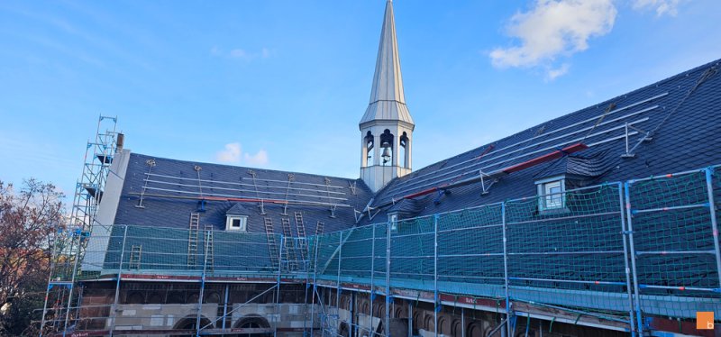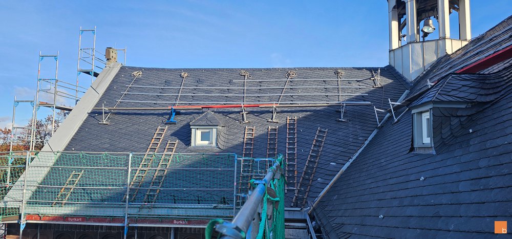 Auf den oberen Dachflächen auf der Süd-Westseite der Kirche Herz Jesu in Ettlingen ist inzwischen die neue Dacheindeckung aufgebracht.