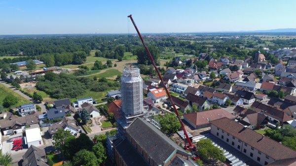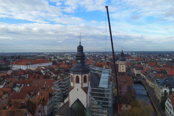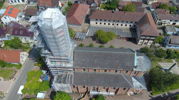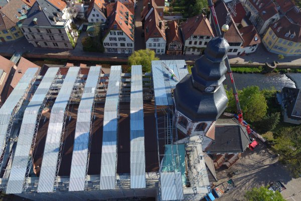 Turm der Kirche St. Martin in Ettlingen wird verschalt und gedeckt