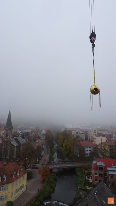 Am Freitag, 12.11.2021 wurde das Kreuz und die Kugel abgenommen. In einer Höhe von ca. 45 m waren diese an der Holzkonstruktion des Turmhelms befestigt.